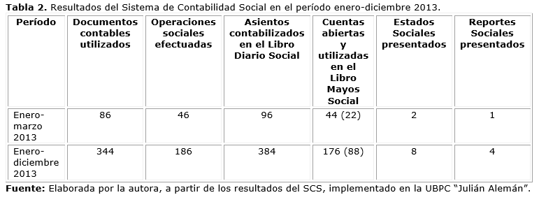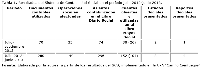 La implementación del Sistema de Contabilidad Social abarcó para los efectos de este trabajo, el período julio 2012-junio 2013. El SCS se continúa aplicando como parte del sistema de trabajo de esta cooperativa. La cantidad de documentos contables utilizados, operaciones sociales efectuadas, asientos de diario contabilizados en el Libro Diario Social, cuentas abiertas y utilizadas en el Libro Mayor Social, estados sociales y el reporte social generados por el sistema durante el año, se muestran en la (Tabla 1).