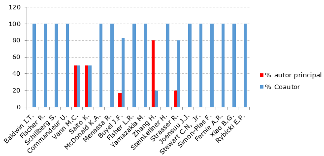 Llama la atención, que los autores más productivos, resaltando los casos de quienes ocupan las posiciones del 1 al 4, no actuaron como primer autor en ninguno de sus trabajos. La figura 2 muestra el comportamiento de la autoría de estos.