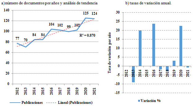 The scientific production under study shows an increasing trend during the period 2012-2021 (Figure 1, item a), with the highest number of papers in the years 2020 and 2021; however, the increase has not been stable over time. The highest interannual variations in terms of number of papers are shown in 2016 and 2020, when the variation rate expresses the highest values (23.81 and 22.55 %, respectively). The lowest variation rate was in 2013, which showed a value of 20% (Figure 1, item b).