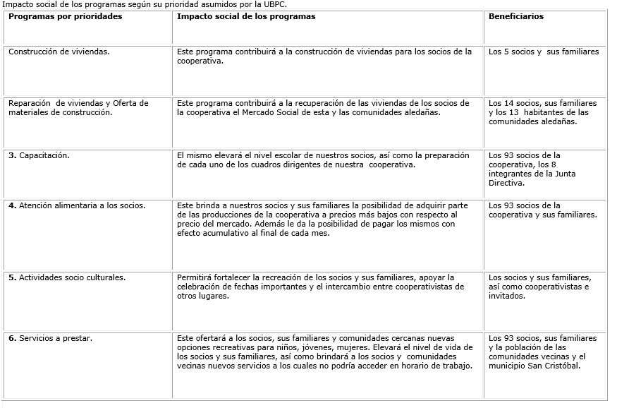 Los Programas a trabajar en el año constituyen los activos sociales con que cuenta la cooperativa y donde se materializa la responsabilidad social asumida, constituyendo los compromisos que asumirá la UBPC durante el período y determinará el accionar social de la UBPC. (Ver cuadro)