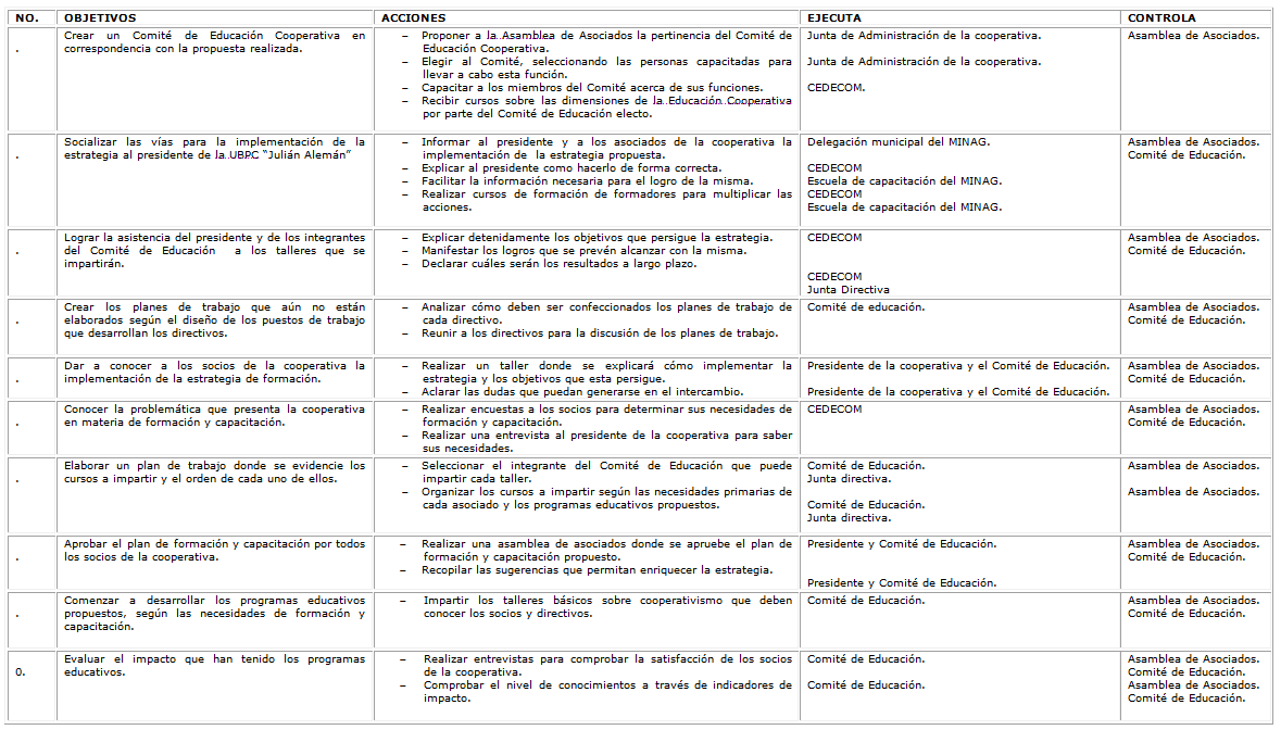 - Confeccionar un plan de formación para contribuir al proceso educativo en la cooperativa y junto a ello crear los métodos y técnicas de control y evaluación en la UBPC «Julián Alemán».