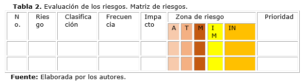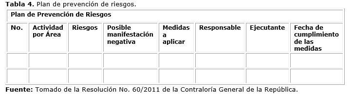 El plan de prevención de riesgos se estructura en: áreas o actividad, riesgos, posibles manifestaciones negativas, medidas a aplicar, responsable, ejecutante y fecha de cumplimiento de las medidas. (Tabla 4)