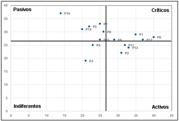 Teniendo en cuenta los resultados de la matriz, se procede a su representación gráfica. Dicho gráfico incluye las siguientes categorías de variables: problemas críticos, pasivos, indiferentes y activos. Posteriormente, se toma el mayor valor de los problemas activos en la matriz y se divide entre dos; este resultado permite ubicar el valor correspondiente en el eje X, a partir del cual se traza una recta paralela al eje Y. El mismo procedimiento se realiza con los problemas pasivos. Una vez ejecutados estos pasos, se está en condiciones de ubicar todos los problemas según sus valores activos y pasivos (Figura 2).
