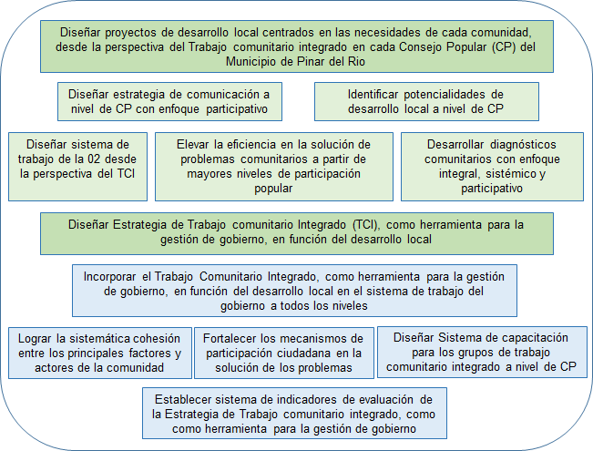 Los resultados obtenidos a lo largo del proceso del DCP, junto con la triangulación de los demás instrumentos aplicados -entre ellos, entrevistas individuales a funcionarios de la Asamblea Municipal del Poder Popular-, aportaron información relevante para la identificación de los principales problemas que inciden en el Trabajo Comunitario Integrado como herramienta para la gestión de gobierno. Estos resultados contribuyeron, además, a la elaboración de las dimensiones de trabajo y de los objetivos estratégicos esenciales para el diseño de la estrategia de Trabajo Comunitario Integrado como herramienta para la gestión de gobierno, en función del desarrollo local.