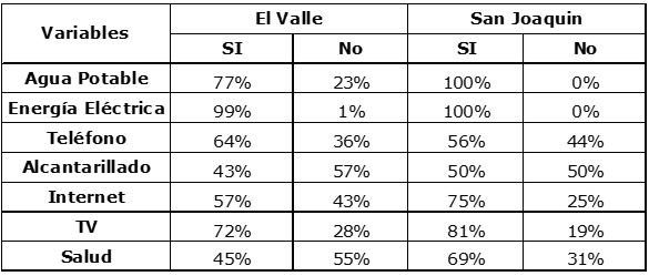 Como se muestra en la tabla 2, la situación en cuanto a disponibilidad de servicios para las personas que viven en San Joaquín es más favorable, en relación con la disponibilidad de alcantarillado y TV; esta diferencia se hace más notable en relación con los indicadores de disponibilidad de seguro para salud y servicios de internet, servicios que, en relación con la pirámide de satisfacción, se encuentran en un mayor nivel.